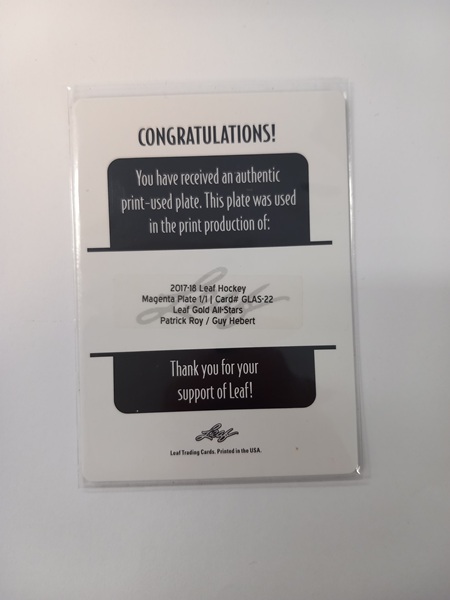 2017-18 Leaf Gold All-Stars Printing Plate Magenta 1/1 Patrick Roy / Guy Herbert #GLAS-22