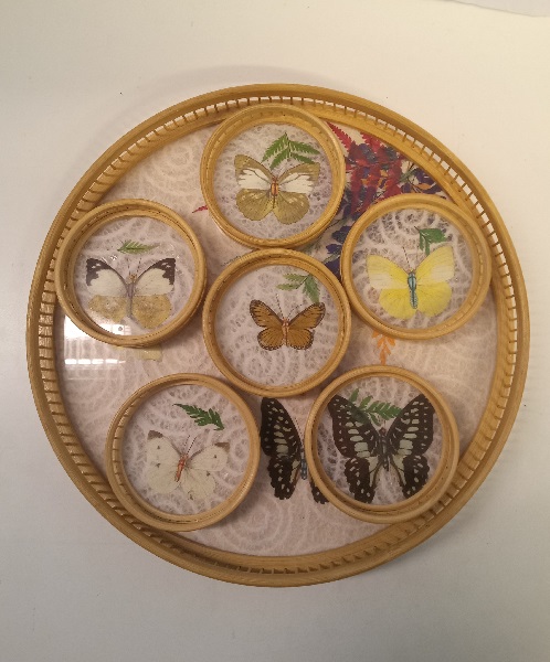 Perhoskuvilla varustettuja lasinalusia 6kpl + kori.
