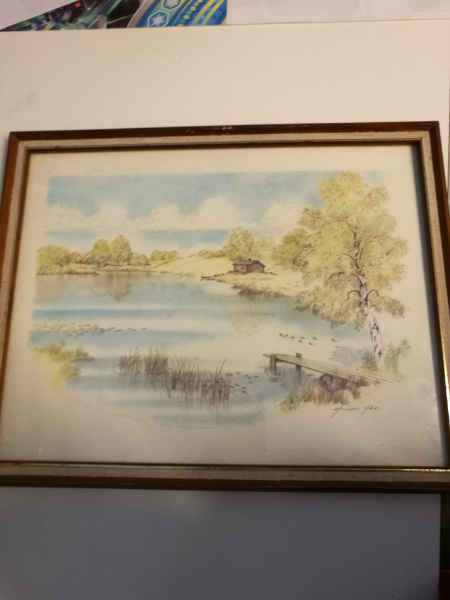 Hieno järvimökki-maisemapiirros, allekirjoitus Antero Aho