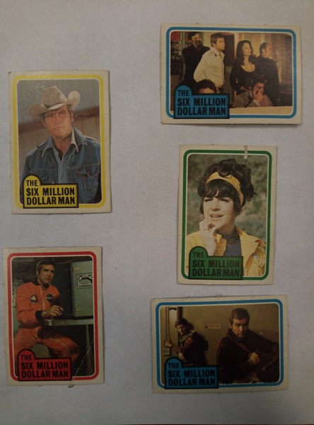 Kortin alareunassa teksti: THE SIX-MILLION DOLLAR MAN; keskellä värikuva TV-sarjan näyttelijöistä eri tilanteissa.